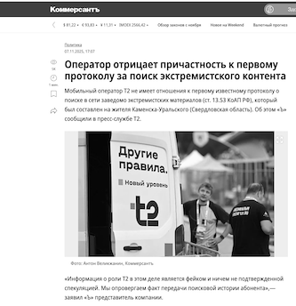 Мобильный оператор T2 не имеет отношения к первому известному протоколу о поиске в сети заведомо экстремистских материалов (ст. 13.53 КоАП РФ), который был составлен на жителя Каменска-Уральского (Свердловская область). Об этом «Ъ» сообщили в пресс-службе T2.