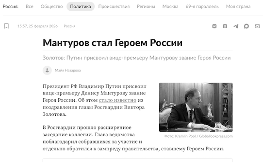 «От имени личного состава Росгвардии поздравил Дениса Мантурова с прошедшим днем рождения и присвоением высшего звания Героя России», — подчеркнул Золотов. Мантуров был именинником 23 февраля.