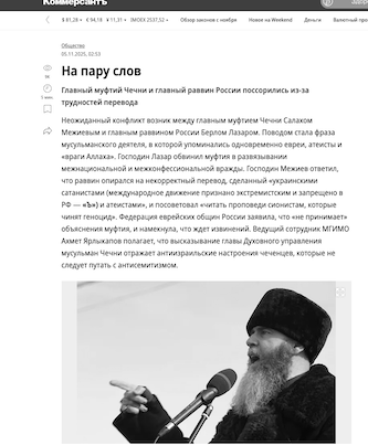 Неожиданный конфликт возник между главным муфтием Чечни Салахом Межиевым и главным раввином России Берлом Лазаром. Поводом стала фраза мусульманского деятеля, в которой упоминались одновременно евреи, атеисты и «враги Аллаха». Господин Лазар обвинил муфтия в развязывании межнациональной и межконфессиональной вражды. Господин Межиев ответил, что раввин опирался на некорректный перевод, сделанный «украинскими сатанистами (международное движение признано экстремистским и запрещено в РФ — «Ъ») и атеистами», и посоветовал «читать проповеди сионистам, которые чинят геноцид». Федерация еврейских общин России заявила, что «не принимает» объяснения муфтия, и намекнула, что ждет извинений. Ведущий сотрудник МГИМО Ахмет Ярлыкапов полагает, что высказывание главы Духовного управления мусульман Чечни отражает антиизраильские настроения чеченцев, которые не следует путать с антисемитизмом.