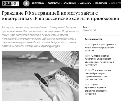 Говорит гендиректор группы компаний ComNews Леонид Коник:«Блокировка VPN происходит по принципу блокировки иностранных IP-адресов, потому что VPN подставляет российскому пользователю IP из другой страны. Интернет-площадки, которые выполнили просьбы российского регулятора блокировать доступ через VPN, просто перекрыли возможность захода с иностранных IP. В результате добросовестные российские граждане, которые не используют VPN, но находятся за границей, пытаются зайти на тот или иной российский ресурс и получают отказ в обслуживании. Как быть? Покупка иностранной сим-карты не поможет, потому что трафик так же будет восприниматься целевой площадкой в России как зарубежный. Единственный, но не гарантированный шанс — перейти в режим роуминга и, используя сим-карту российского оператора, зайти на нужный ресурс. Это не всегда, но может помочь. В остальных случаях, к сожалению, остается только просить коллег в России сделать какую-то покупку. Кстати, хочу напомнить, что, например, компания РЖД начала блокировать заходы с любых иностранных IP примерно в 2022 году. Лично я, находясь в отпуске, несколько раз пытался купить билеты на сайте РЖД — зайти на сайт за границей было нельзя. И три-четыре года назад я лично просил коллег в России, высылал им номер паспорта, переводил деньги, и они покупали мне нужный билет».