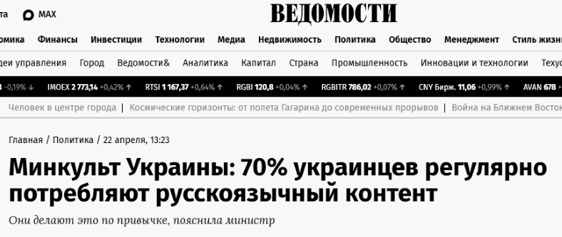 Около 70% украинцев продолжают потреблять русскоязычный контент, сообщила министр культуры Украины Татьяна Бережная со ссылкой на результаты исследования.