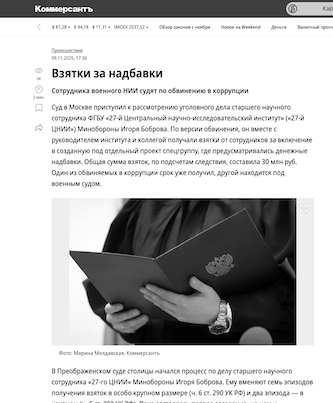 В Преображенском суде столицы начался процесс по делу старшего научного сотрудника «27-го ЦНИИ» Минобороны Игоря Боброва. Ему вменяют семь эпизодов получения взяток в особо крупном размере (ч. 6 ст. 290 УК РФ) и два эпизода — в крупном (ч. 5 ст. 290 УК РФ). Пока состоялось первое заседание, на нем к рассмотрению обвинения по существу не приступали — было лишь рассмотрено ходатайство прокурора о продлении господину Боброву срока ареста на полгода. Гособвинитель заявил, что фигурант обвиняется в совершении тяжких преступлений и поэтому может попытаться скрыться.