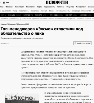 Следственный комитет отпустил после допроса топ-менеджеров издательства «Эксмо», включая гендиректора Евгения Капьева и заместителя главного редактора по литературе Юлию Соколовскую. Они проходят по делу о распространении книг с упоминанием гомосексуальных связей. Об этом ТАСС сообщили в правоохранительных органах.