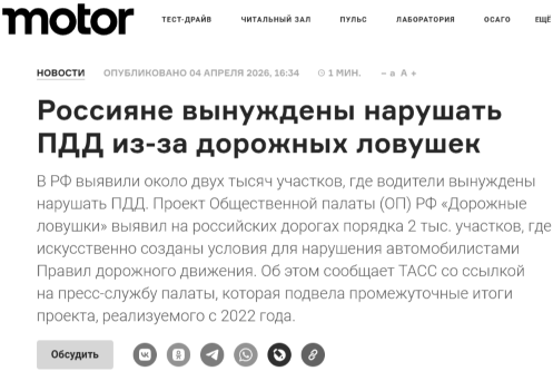 В РФ выявили около двух тысяч участков, где водители вынуждены нарушать ПДД. Проект Общественной палаты (ОП) РФ «Дорожные ловушки» выявил на российских дорогах порядка 2 тыс. участков, где искусственно созданы условия для нарушения автомобилистами Правил дорожного движения. Об этом сообщает ТАСС со ссылкой на пресс-службу палаты, которая подвела промежуточные итоги проекта, реализуемого с 2022 года.