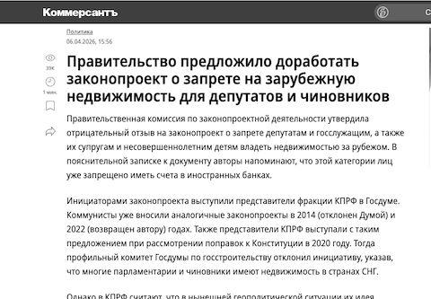 Правительственная комиссия по законопроектной деятельности утвердила отрицательный отзыв на законопроект о запрете депутатам и госслужащим, а также их супругам и несовершеннолетним детям владеть недвижимостью за рубежом. В пояснительной записке к документу авторы напоминают, что этой категории лиц уже запрещено иметь счета в иностранных банках.
